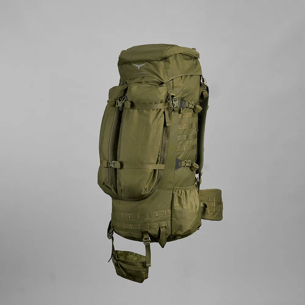 Объем 80 литров позволяет упаковать снаряжение на 7-10 суток автономной работы. Рюкзак Ермак-80 оснащен карбоновой рамой, которая весит всего 400 граммов, но выдерживает нагрузку до 40 кг. Рама регулируется по высоте под рост бойца от 165 до 195 см.