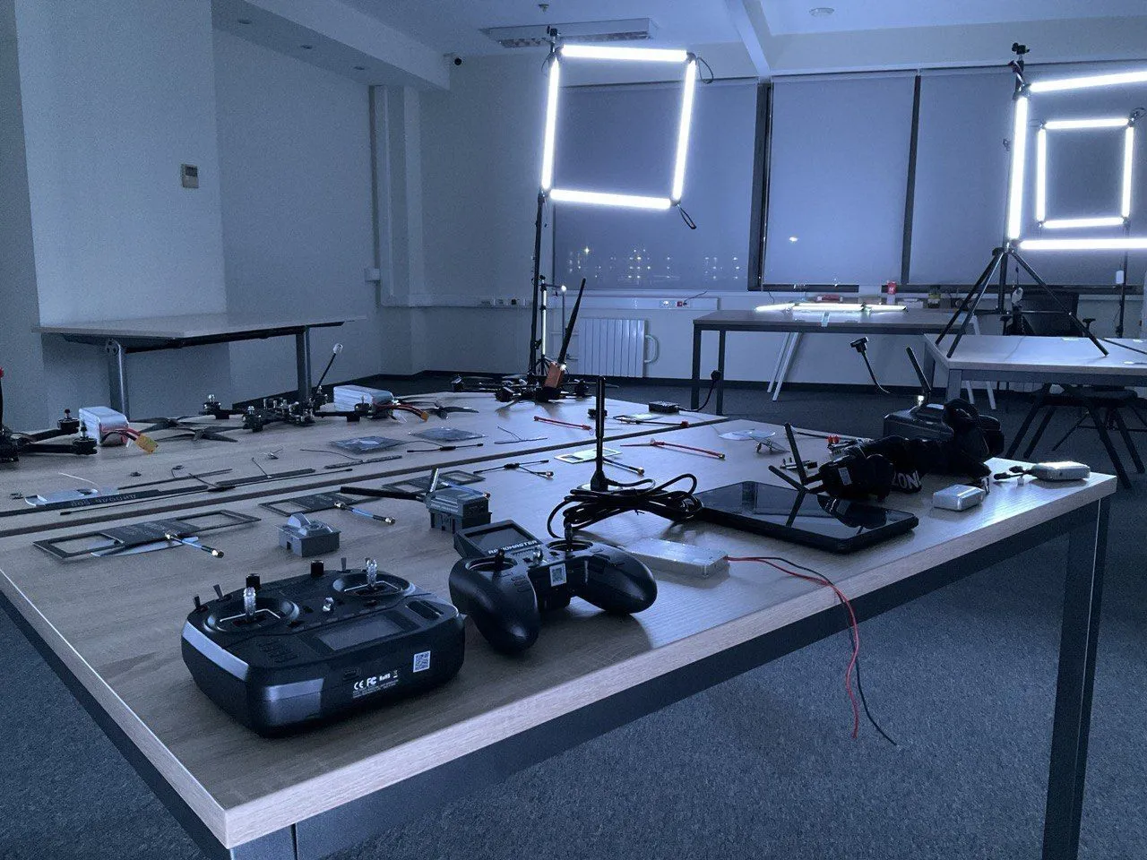 Светодиодная трасса для гонок мини-дронов с воротами квадратной и пентагональной формы.