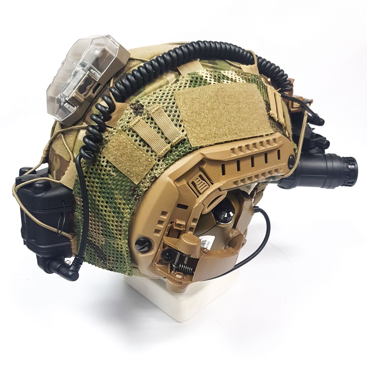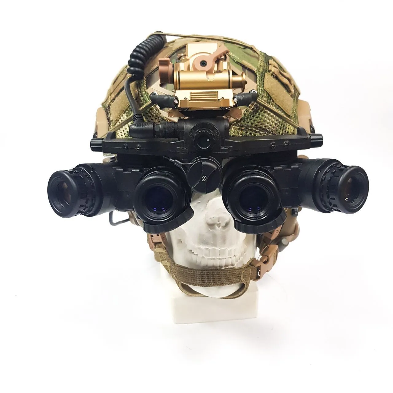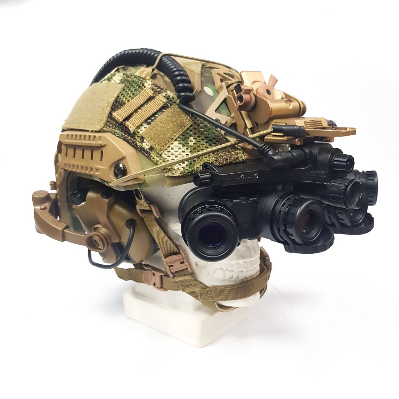 Питается прибор от одного аккумулятора 16340 либо батарейки CR123, также возможно использовать с выносным блоком на затылок шлема под четыре аналогичных элемента питания. Крепление ПНВ на шлем под shroud/wilcox идет в комплекте.