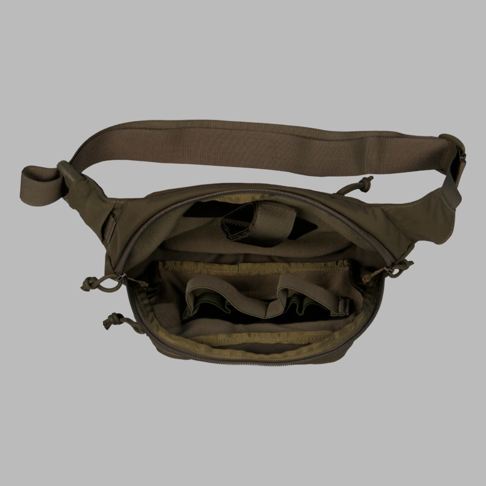 Основной отдел выполнен из мягкой велкро ткани с усиленной велкро-панелью для надёжного крепления кобуры (универсальный вкладыш идет в комплекте).