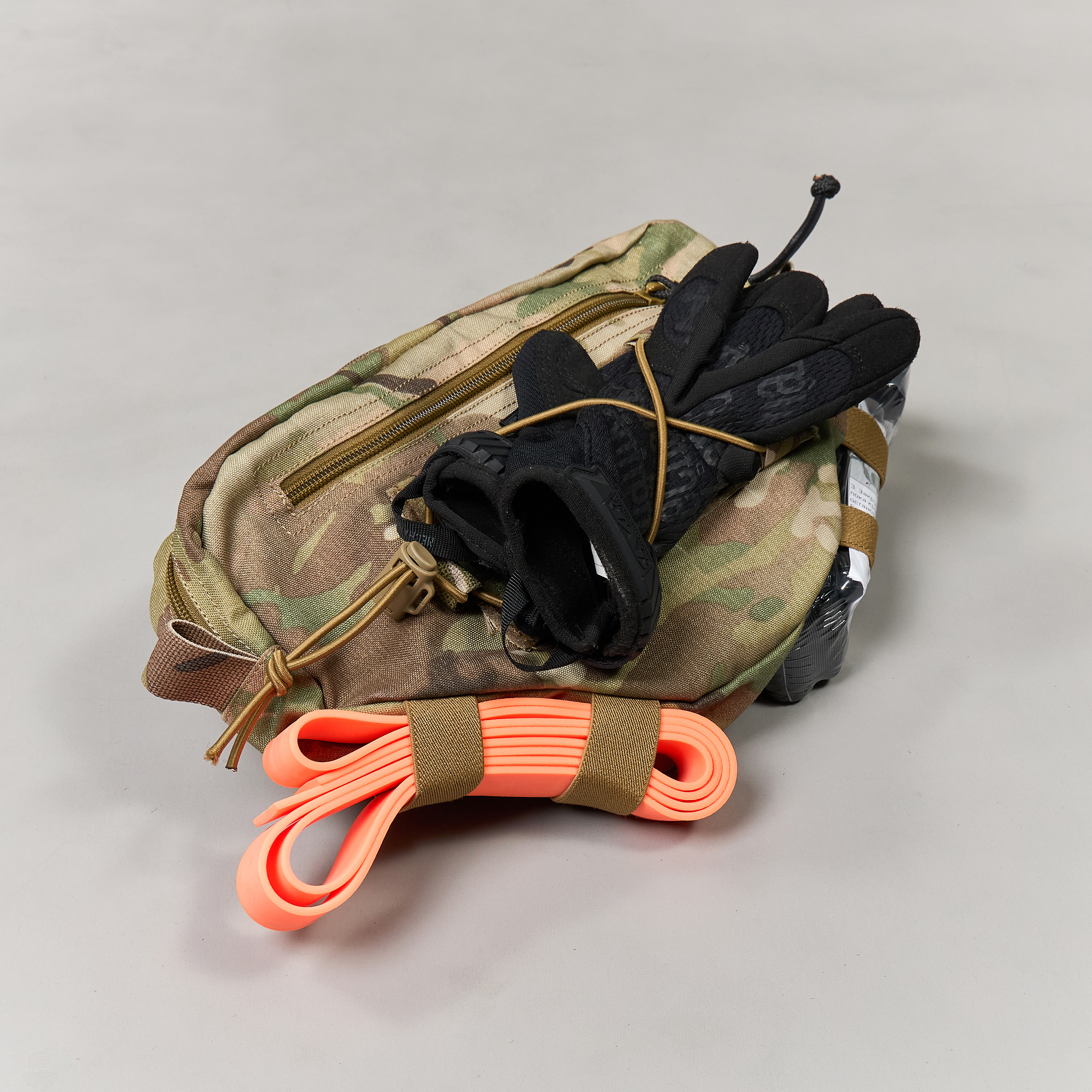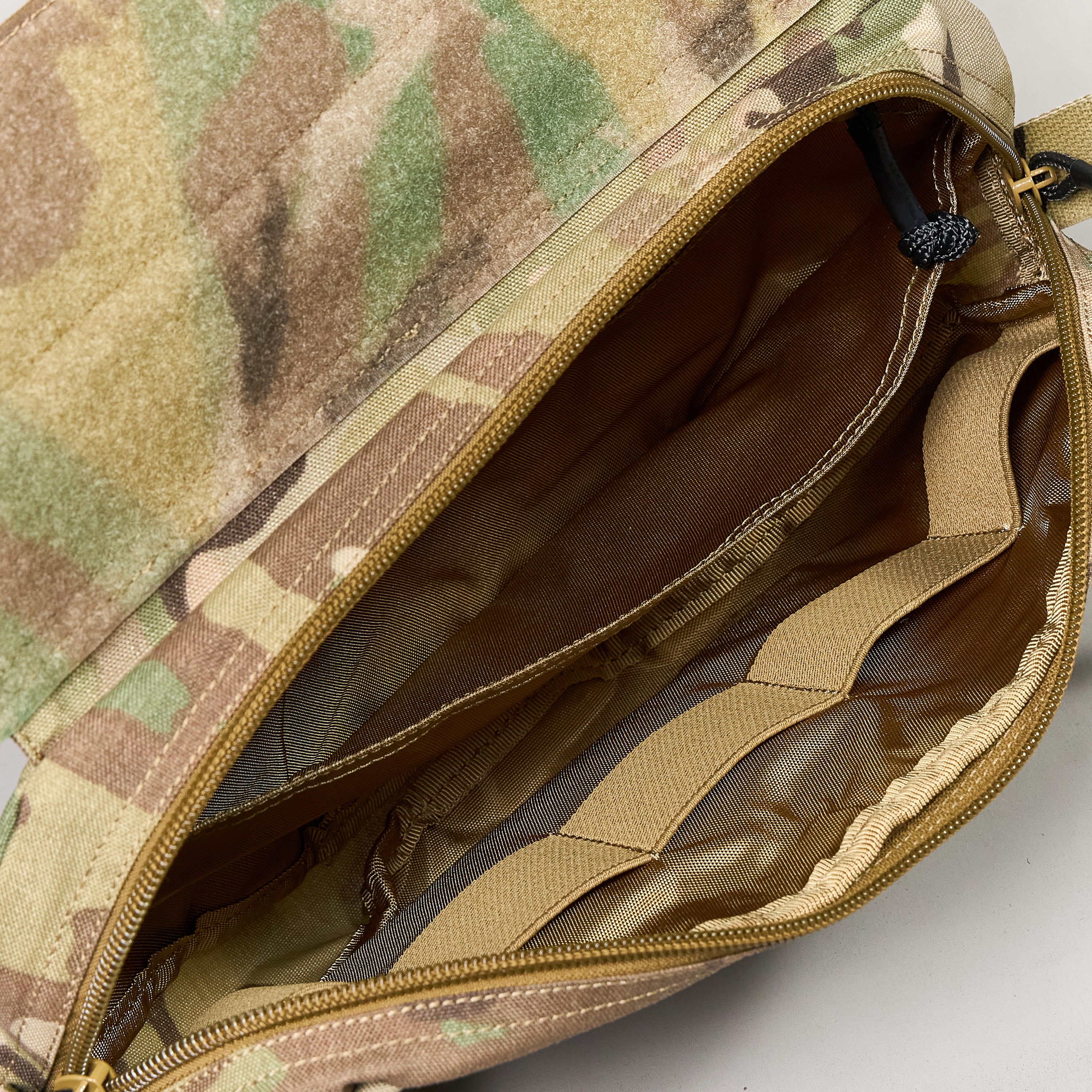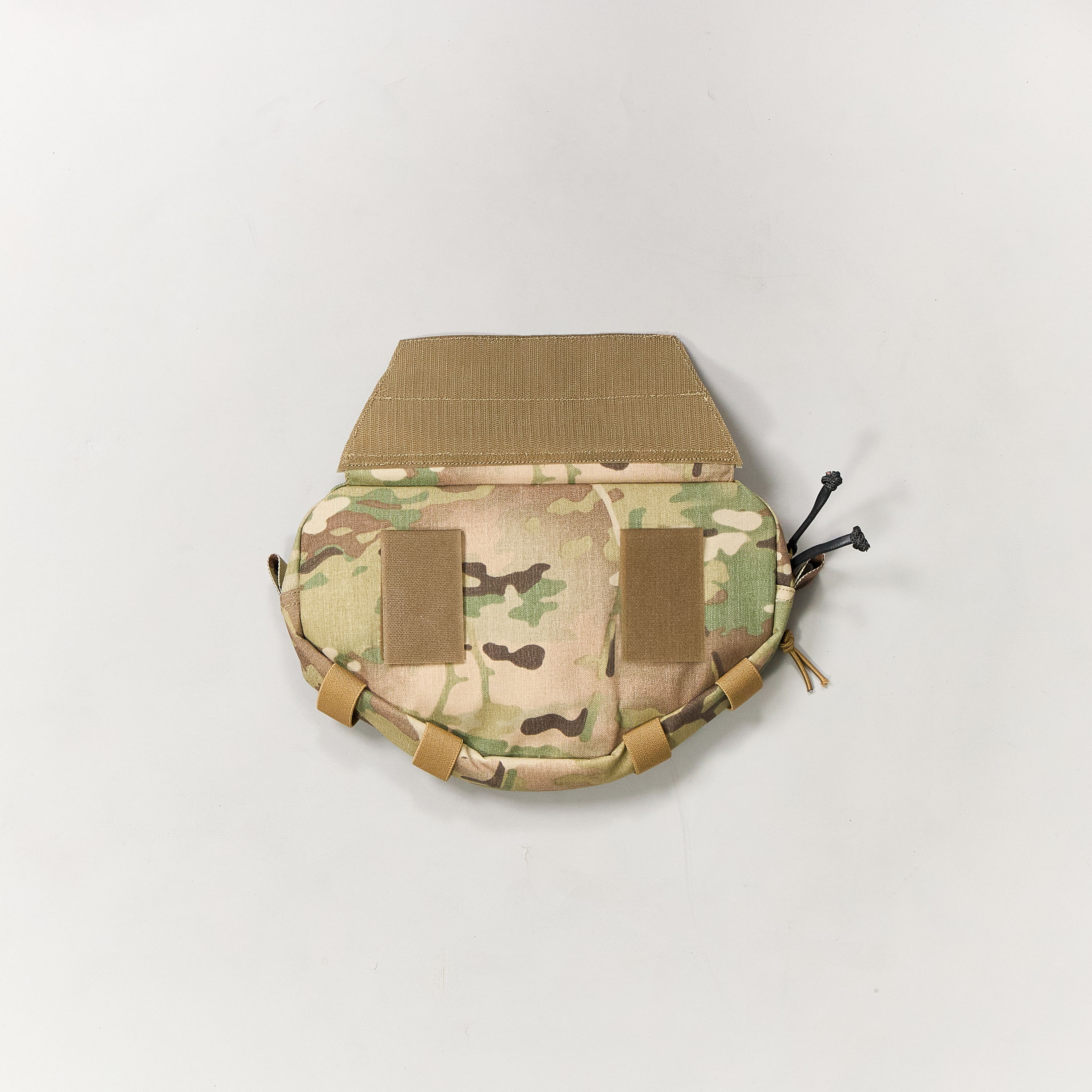 Абдоминальный подсумок с велкро-панелью для крепления к жилету в верхней части, патч-панелью, выполненной в формате молле на внешней стороне, и плоскими резинками-креплениями на нижней части подсумка.