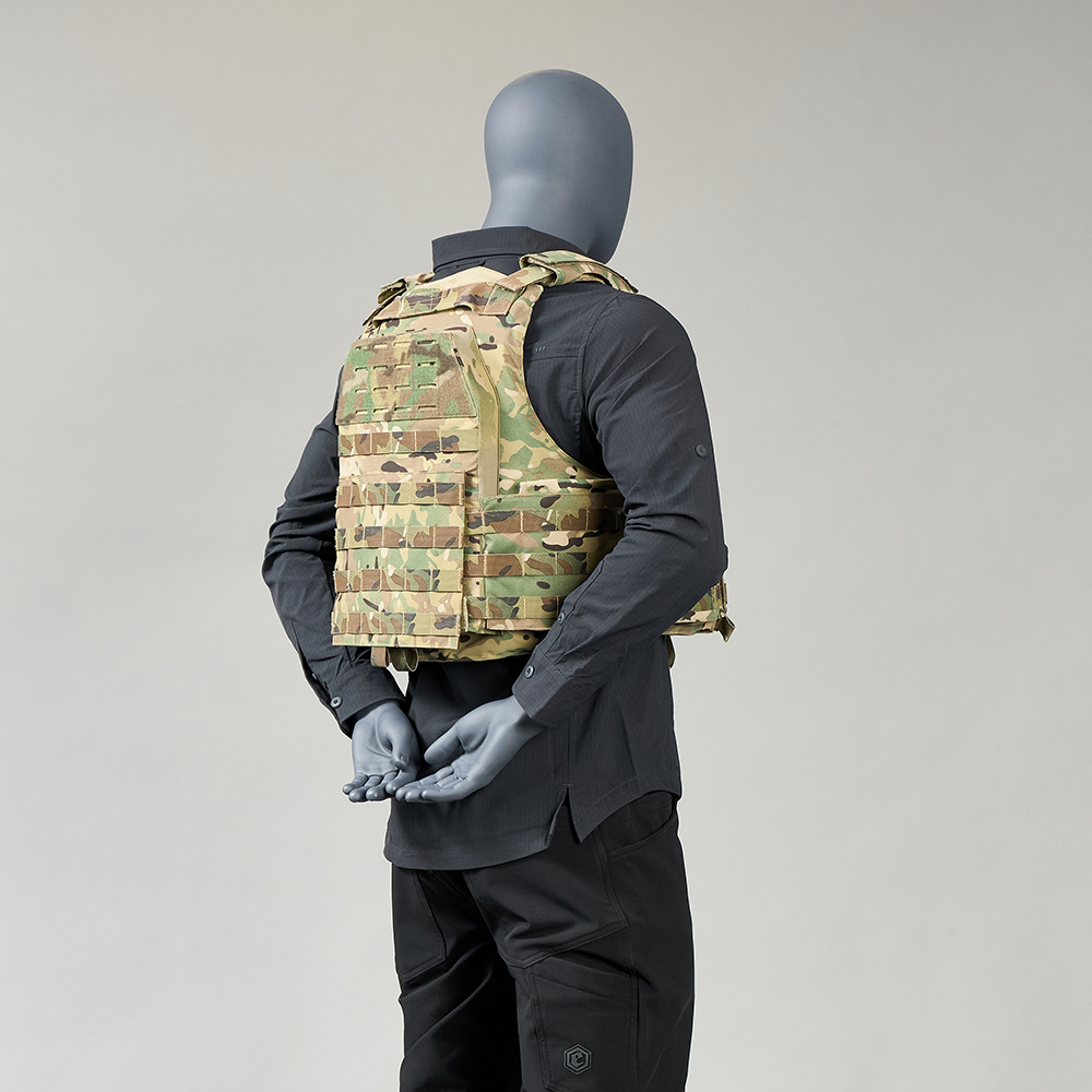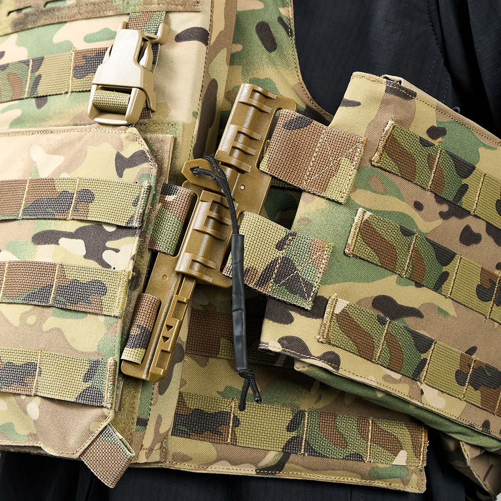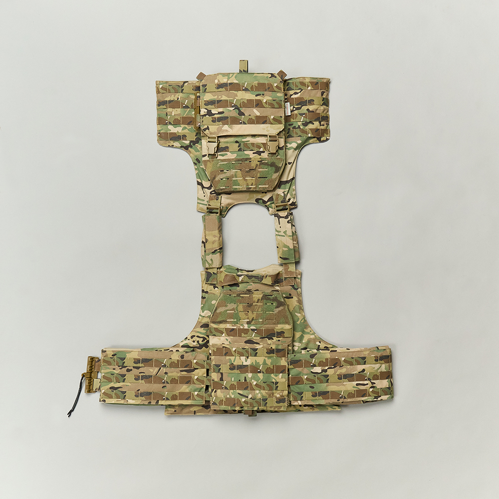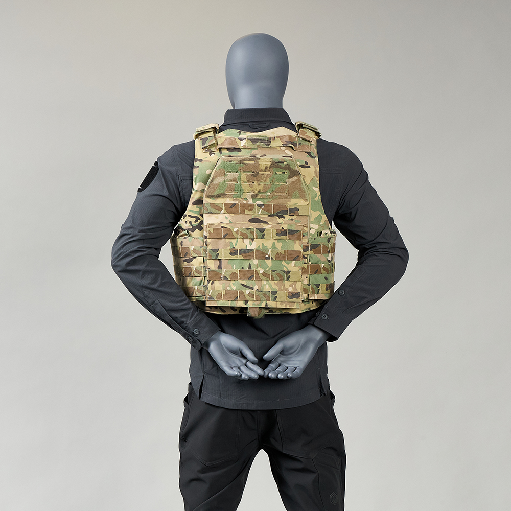 Обеспечивает баллистическую защиту класса Бр2 по груди, спине и бокам благодаря встроенным противоосколочным пакетам из СВМПЭ (34 слоя). Возможна установка бронеплит для повышения защиты до класса Бр5. Конструкция предусматривает опциональную установку модулей: горжета, наплечников, защиты паха, бёдер и пятиточечника (в базовую комплектацию не входят).