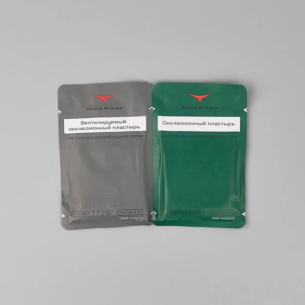 Комплект из двух пластырей – с клапаном (вентилируемый) и без.Проникающие ранения грудной клетки могут привести к напряженному пневмотораксу, второй ведущей причине смерти на поле боя, которую можно предотвратить.